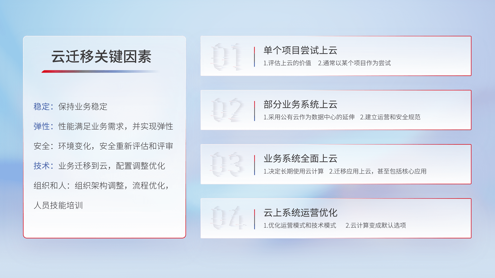 结合实际业务,,,,从规划设计、、云平台选型、、、云原生改造、、、数据迁移、、、集成交付,,,迁移全过程为客户识别最佳上云路径,,做好风险识别管理,,,,设计网络架构、、身份权限、、、安全审计合规、、、、操作审计、、、日志审计、、、、监控告警策略、、多站点容灾设计等,,对云上基础设施进行整体规划,,,,提升IT治理水平,,以满足弹性、、高可用、、、高性能的需求。。