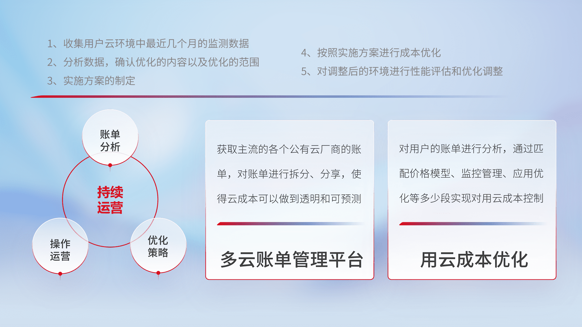 通过多云纳管,,,,以统一的资源数据模型把客户的云资源进行抽象和封装,,,进而实现对多云资源的统一操作,,保障云资源管理的可靠性、、稳定性与可用性。。。量身定制化运维内容,,配置、、、开发运维、、、、补丁管理、、备份、、监控、、、、认证和访问管理、、、、审计和日常巡检等,,,保障在用云过程中的可靠度,,,,稳定度以及高可用率。。。